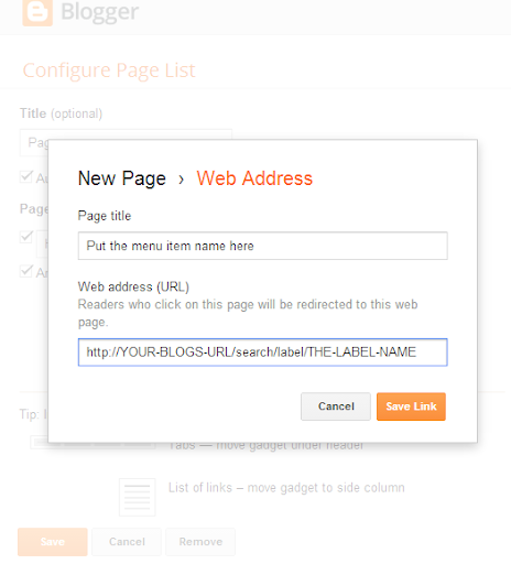 Using Labels to group your Blogger PostsAdding external and internal URLs to your pages-gadget / menu bar