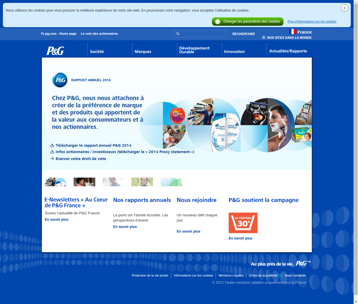 Skip to main content Fr.pg.com - Home page Le coin des actionnaires France NOS SITES DANS LE MONDE Home Primary navigation Suivez lâactualité de P&G France En savoir plus Le point sur l'année écoulée. Les perspectives d'avenir En savoir plus Un nouveau défi chaque jour En savoir plus En savoir plus Au plus près de la vie, P&G Protection de la vie privée Informations sur les cookies Mentions Légales Choix de la publicité Nous contacter © 2013 Toutes mentions valables uniquement pour la France