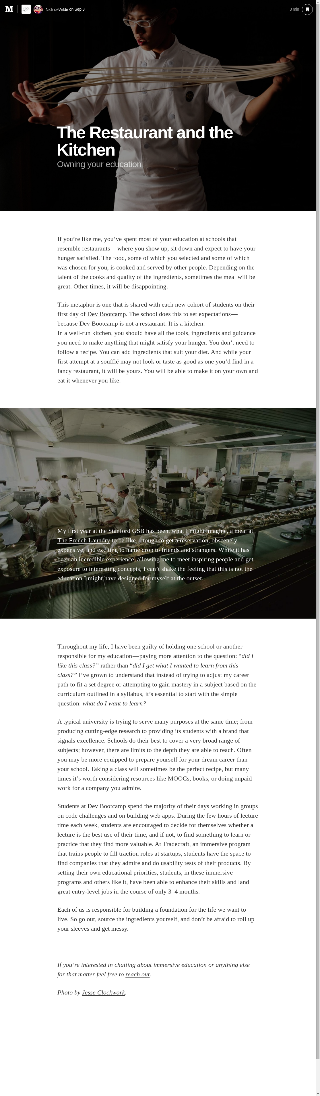 This metaphor is one that is shared with each new cohort of students on their first day of Dev Bootcamp. The school does this to set expectationsâââbecause Dev Bootcamp is not a restaurant. It is a kitchen.