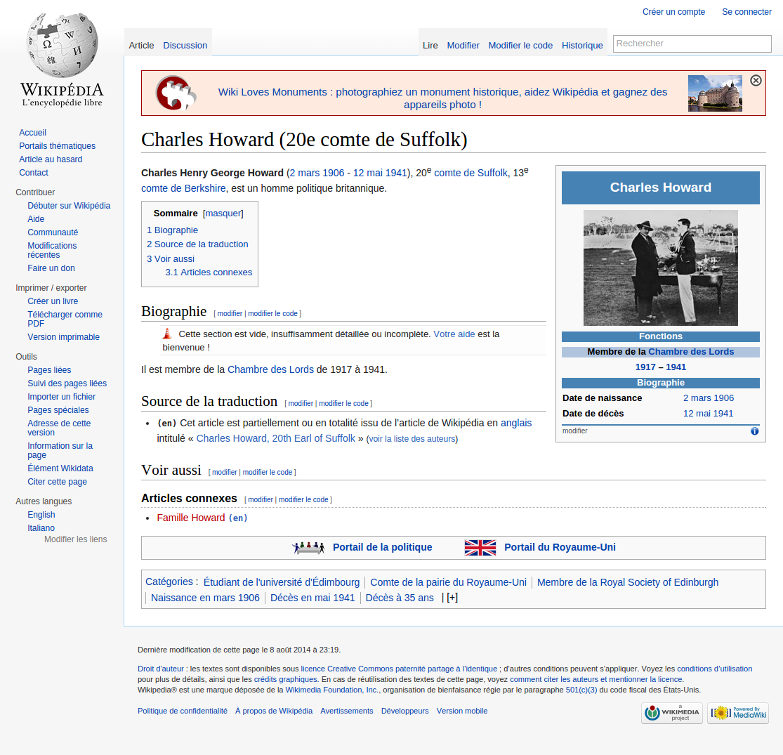 (en) Cet article est partiellement ou en totalité issu de lâarticle de Wikipédia en anglais intitulé « Charles Howard, 20th Earl of Suffolk » (voir la liste des auteurs)