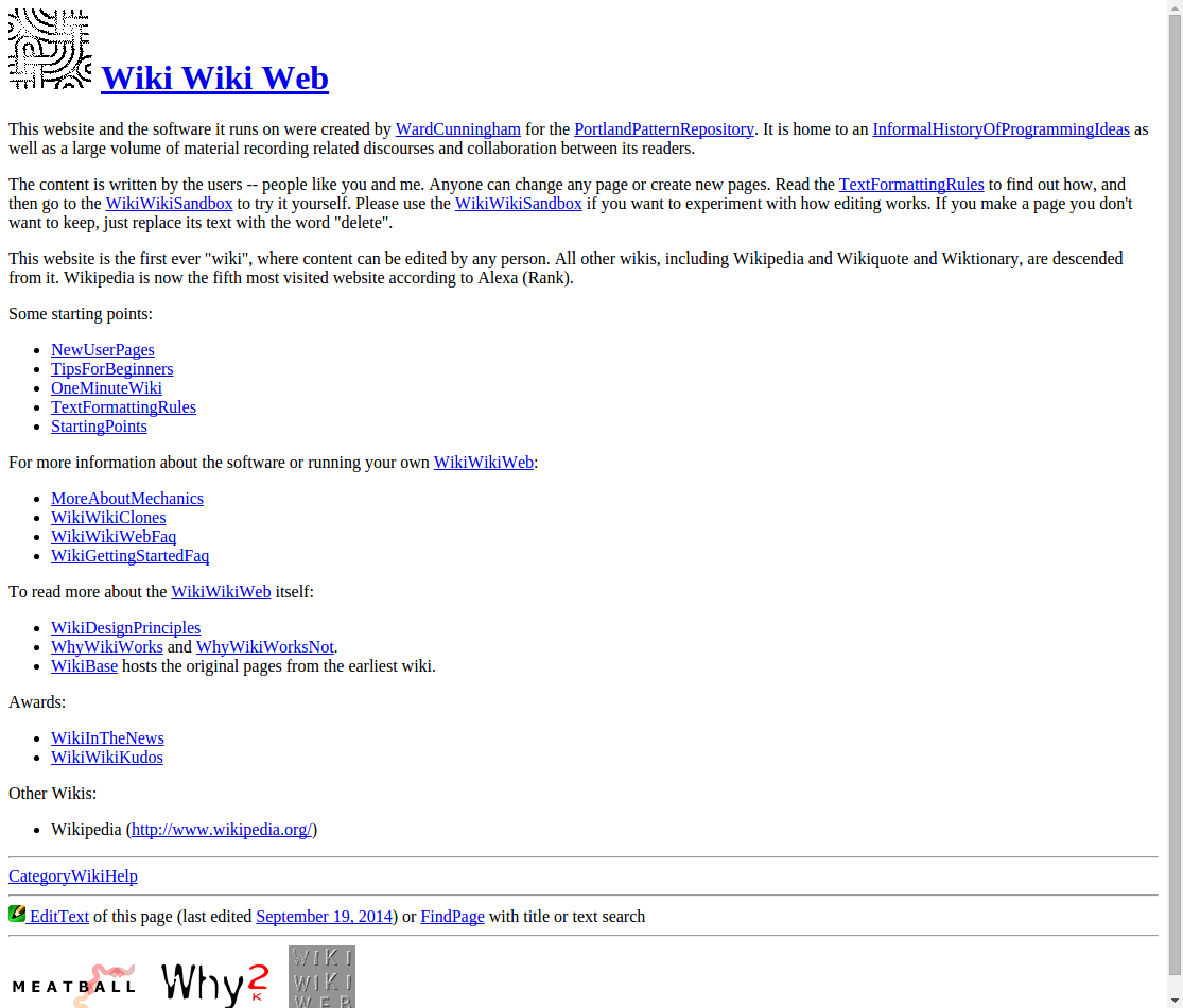 This website is the first ever "wiki", where content can be edited by any person. All other wikis, including Wikipedia and Wikiquote and Wiktionary, are descended from it. Wikipedia is now the fifth most visited website according to Alexa (Rank).