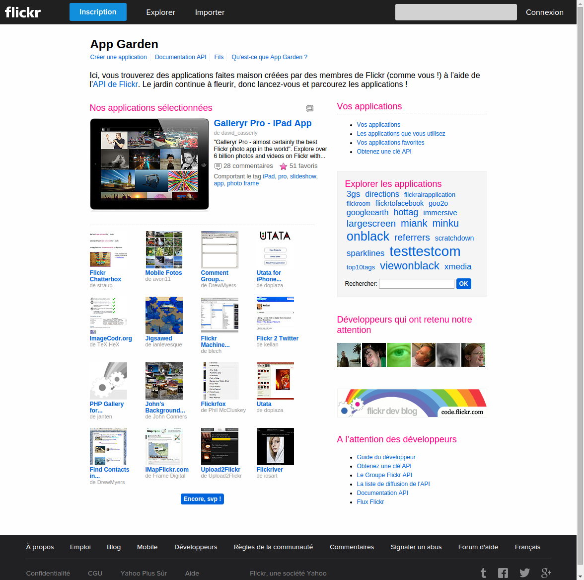 Ici, vous trouverez des applications faites maison créées par des membres de Flickr (comme vous !) à lâaide de l'API de Flickr. Le jardin continue à fleurir, donc lancez-vous et parcourez les applications !